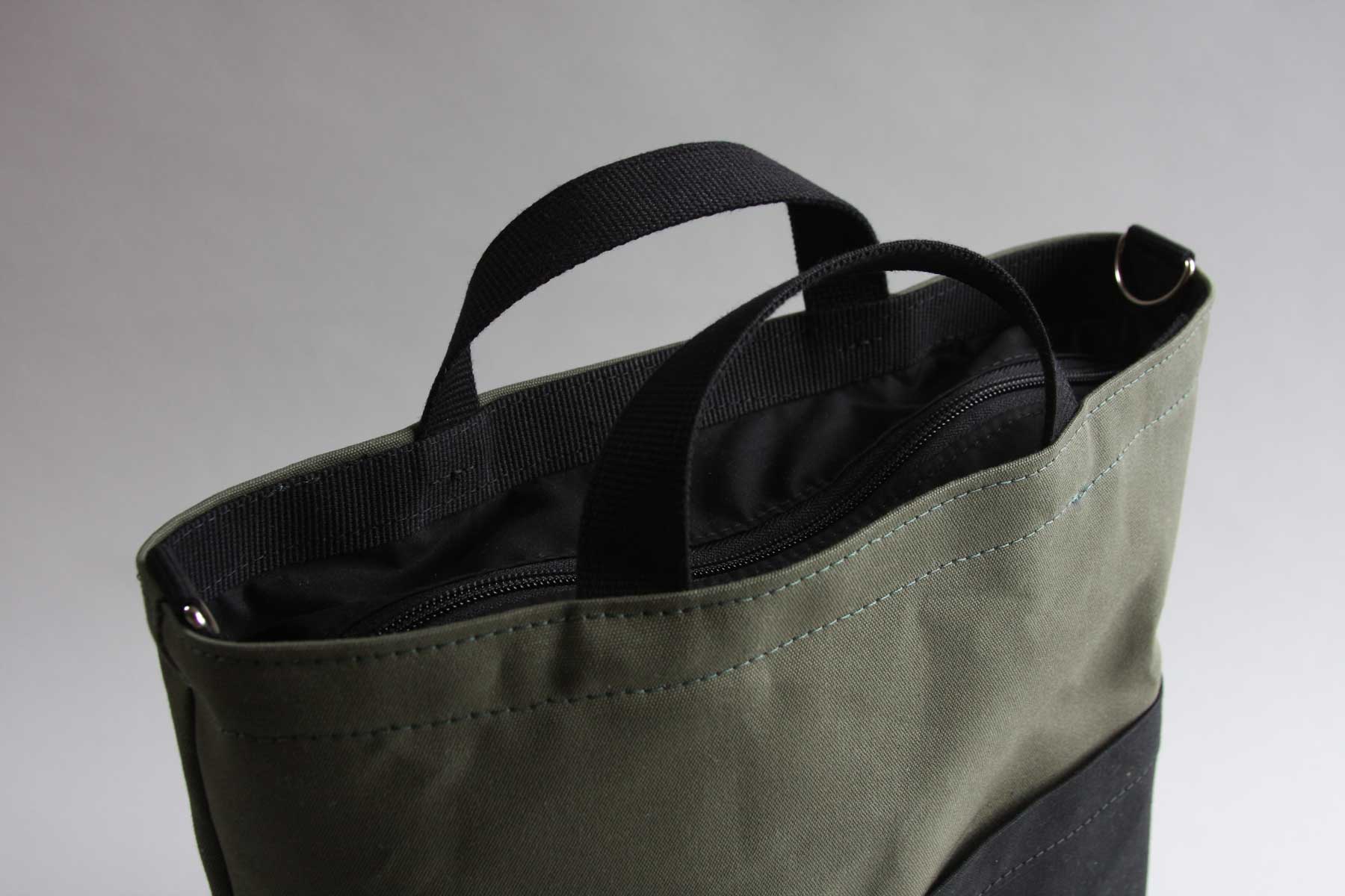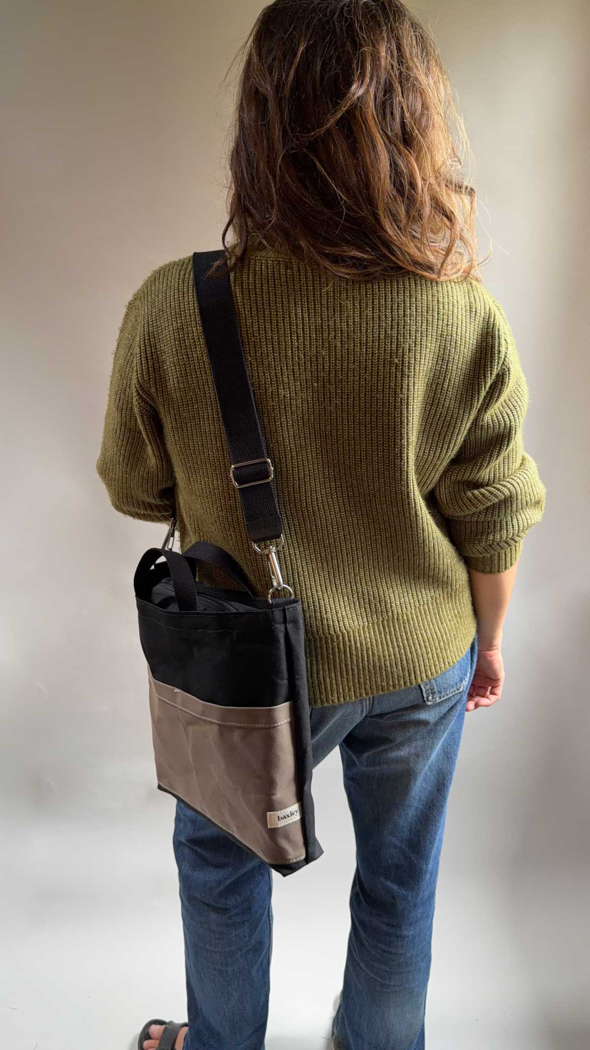 100% organic waxed cotton canvas and lining from British mills, with British and Italian-woven webbing.