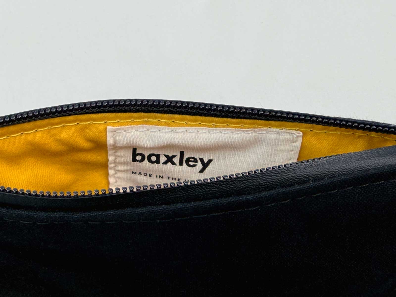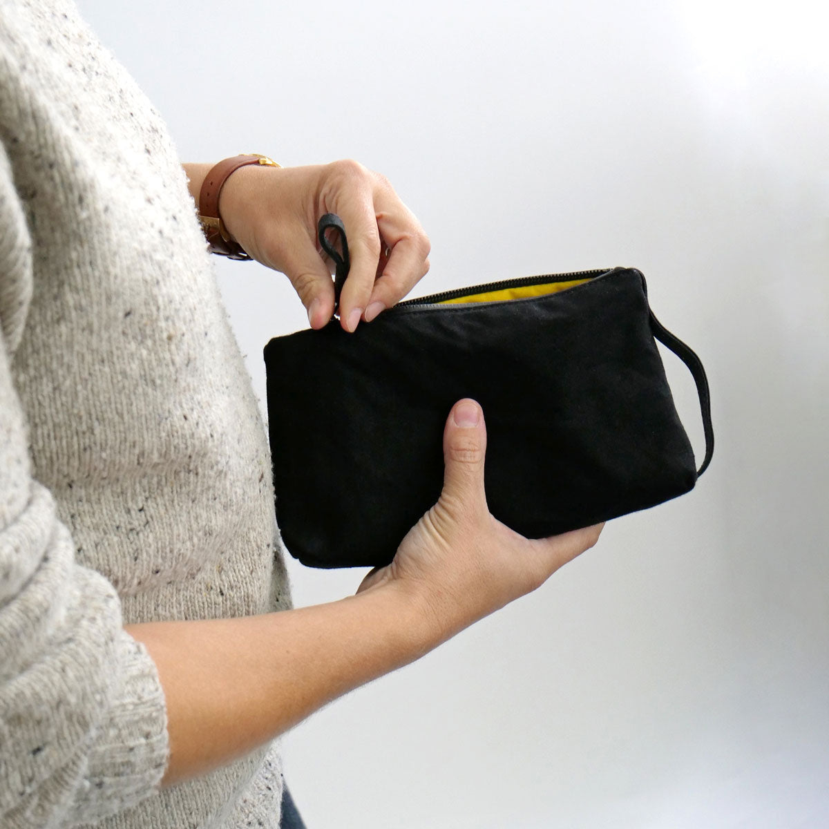 A single zip opens to a cheery yellow lining, bright in colour to ease seeing inside. Strap allows for easy grabbing from within larger bags, or carrying on its own when out and about.